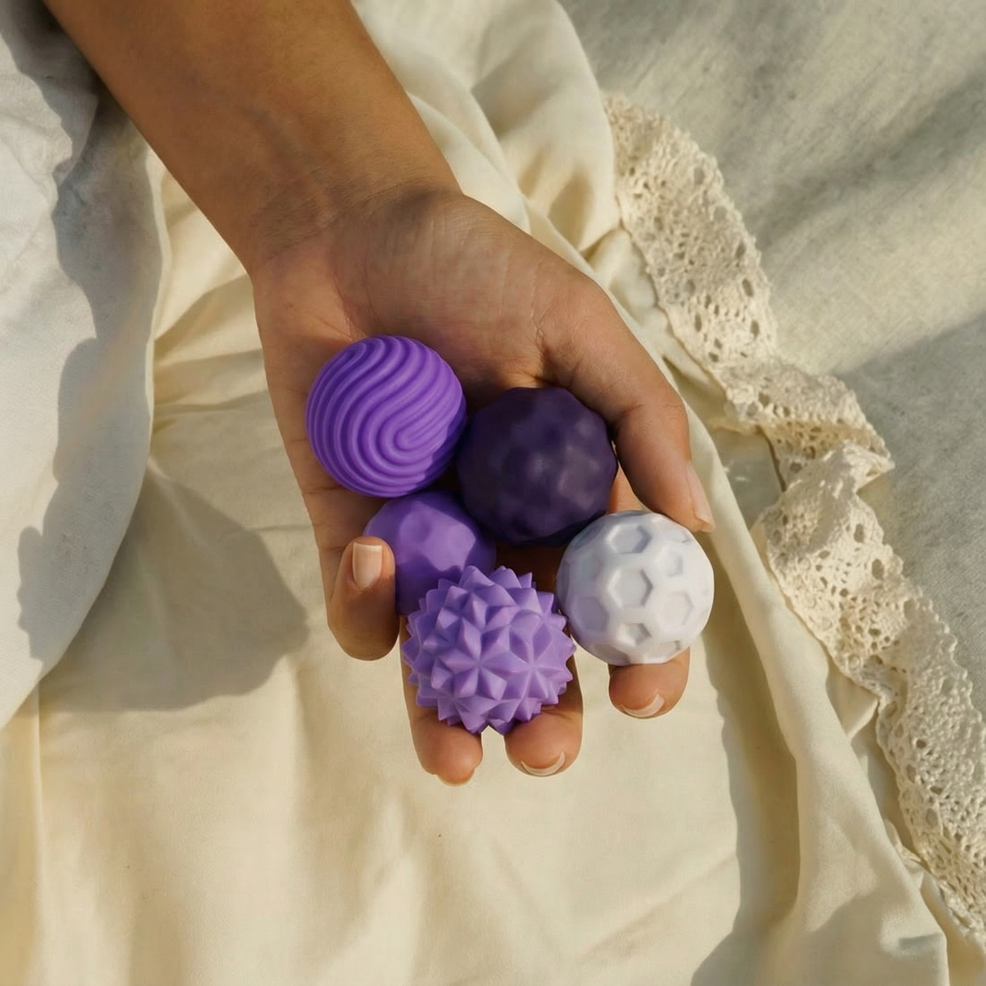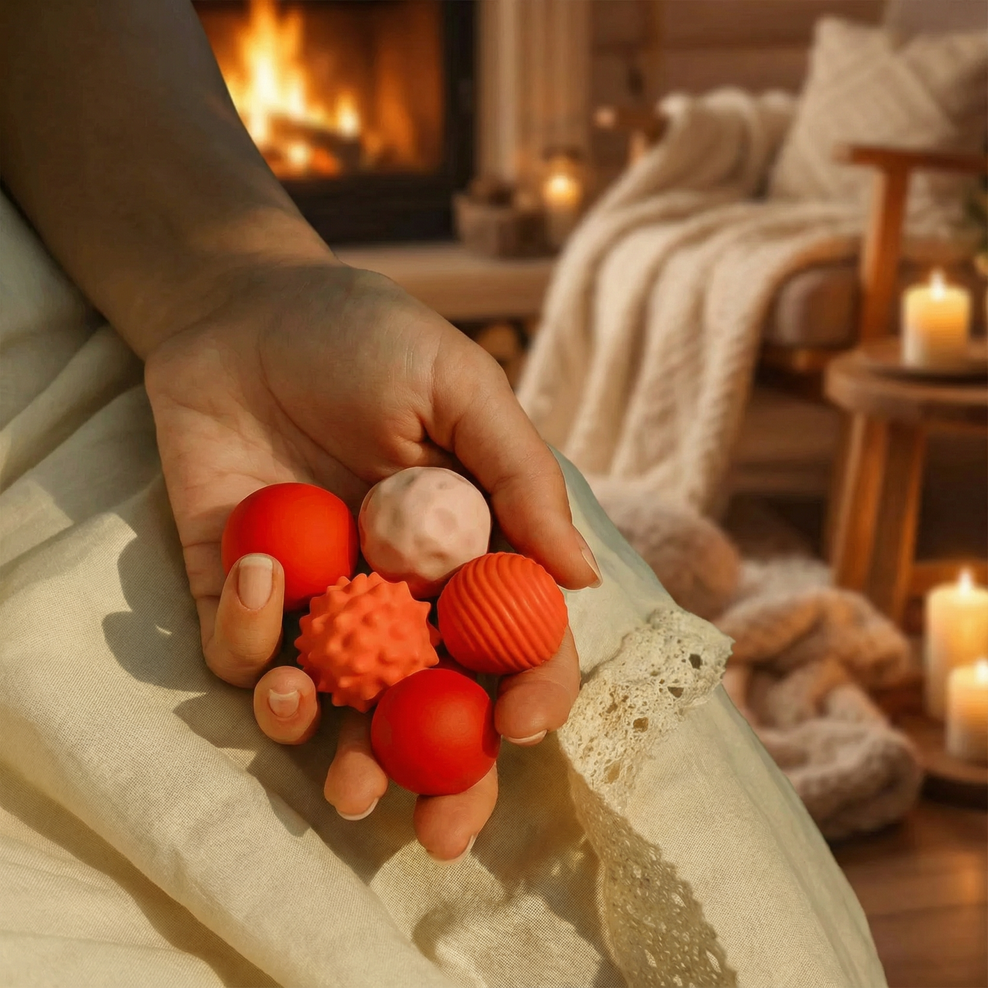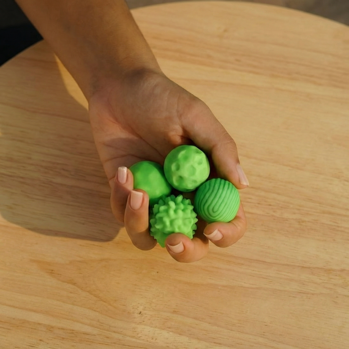 Każda kulka wyróżnia się inną strukturą powierzchni – od wypustek i kolców, przez prążki, aż po wklęsłe formy. Dzięki tej różnorodności zmysł dotyku jest intensywnie pobudzany, co sprzyja rozluźnieniu i wyciszeniu.